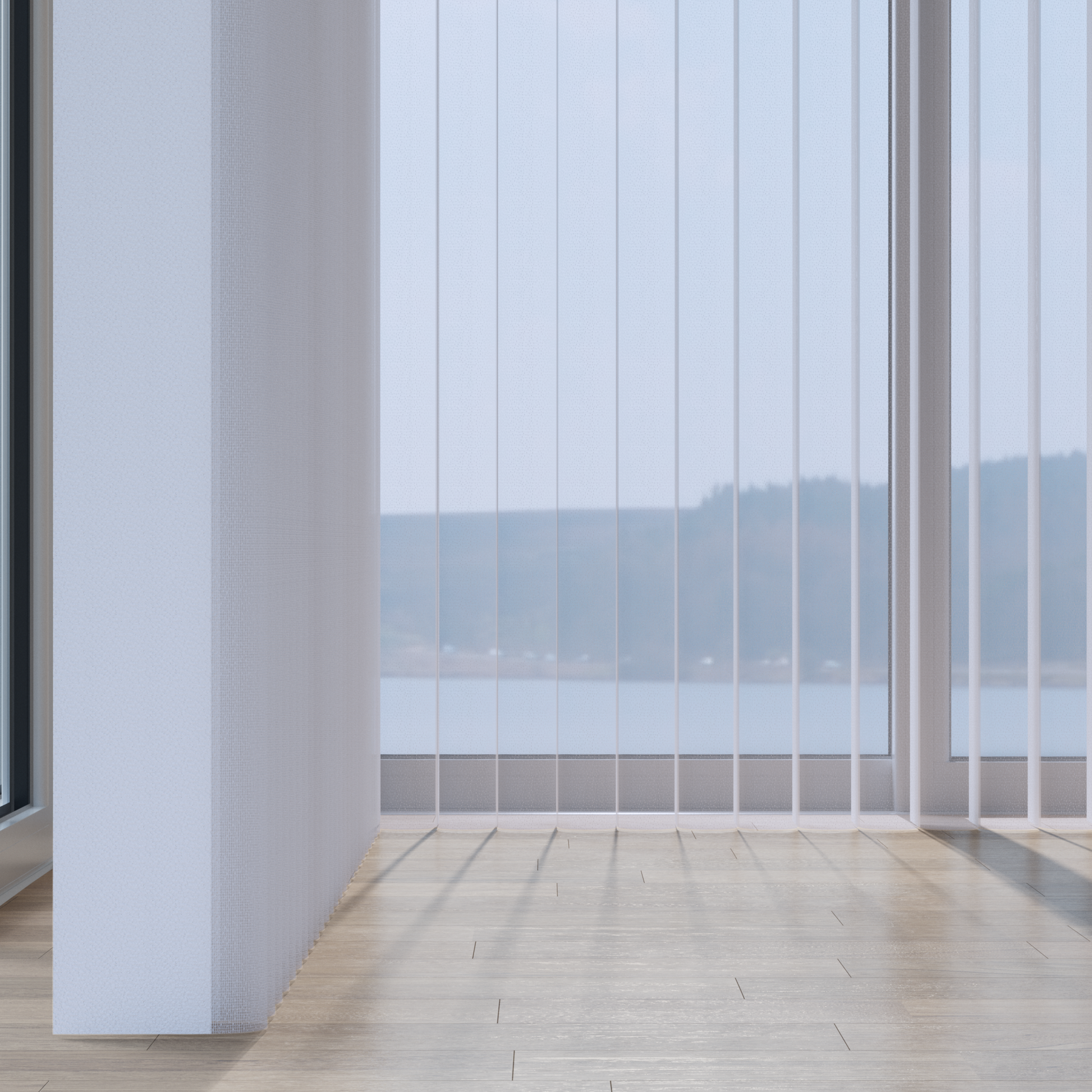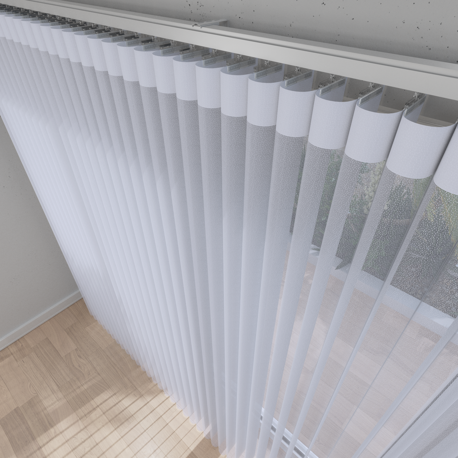 90° — soft, elegant waterfall look with natural sunlight, outside views, and sheer transparency